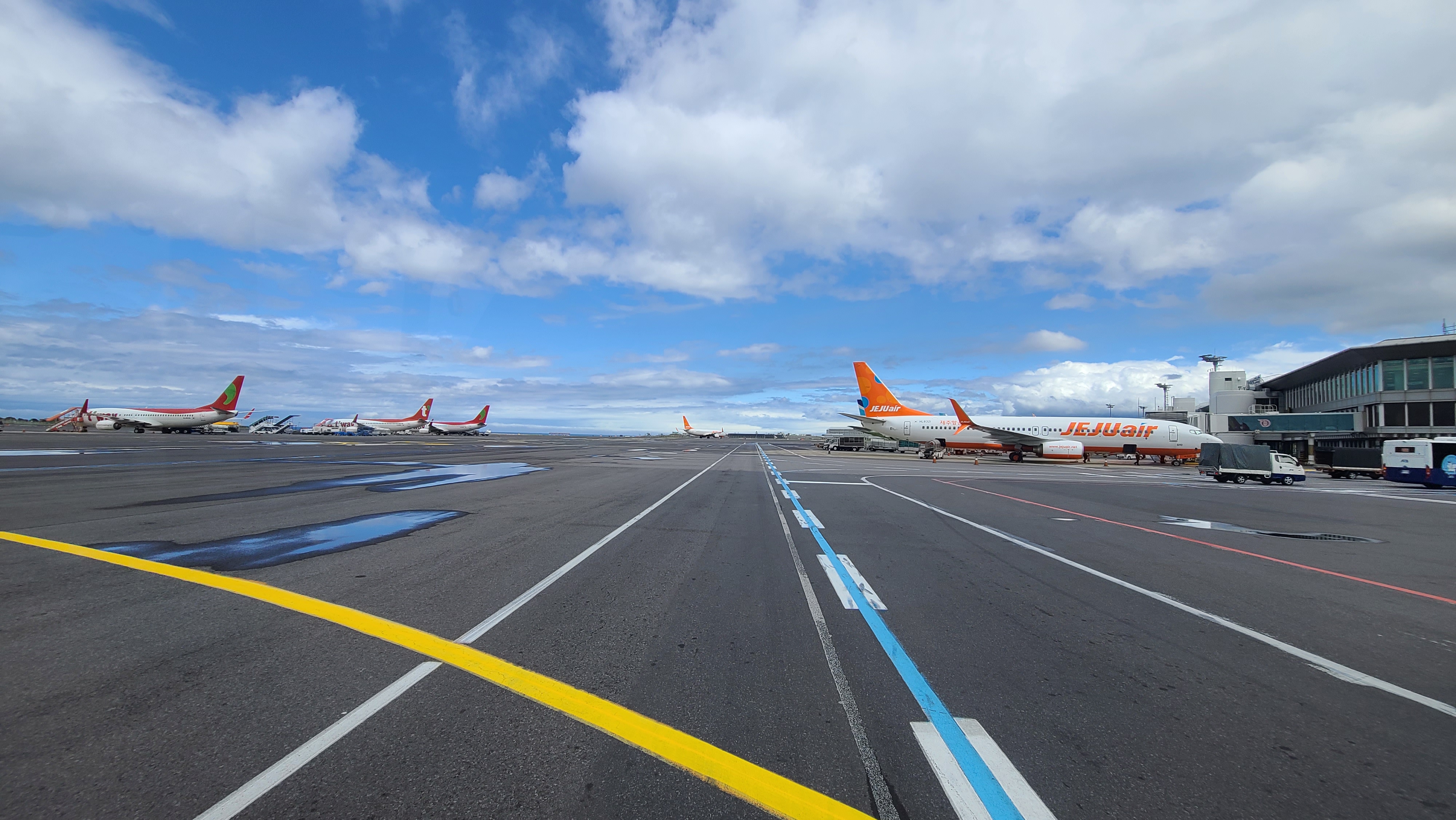 공항건물에서 바로 탑승하지 않고 활주로 안에서 비행기를 탑승했다.